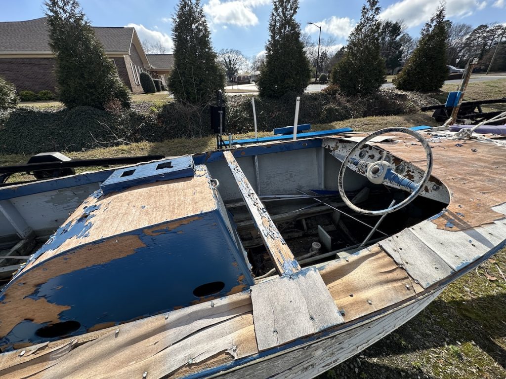 We found this early 1950’s Correct Craft Atom Skier during a trip through Georgia in March of 2024. It had been purchased for its unusual 90 hp 4 cylinder Graymarine engine which was to be rebuilt and put into a 1950’s Chris Craft. The hull was a wreck, but had all the original hardware and was destined for the burn pile so, of course, we bought it. My wife Tisa was drawn to the boat when she saw it. She has since been surprised by how much work a little project can be.