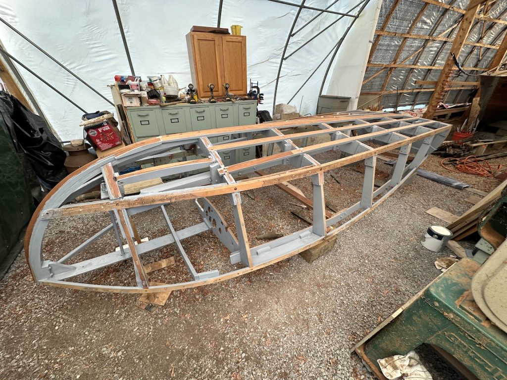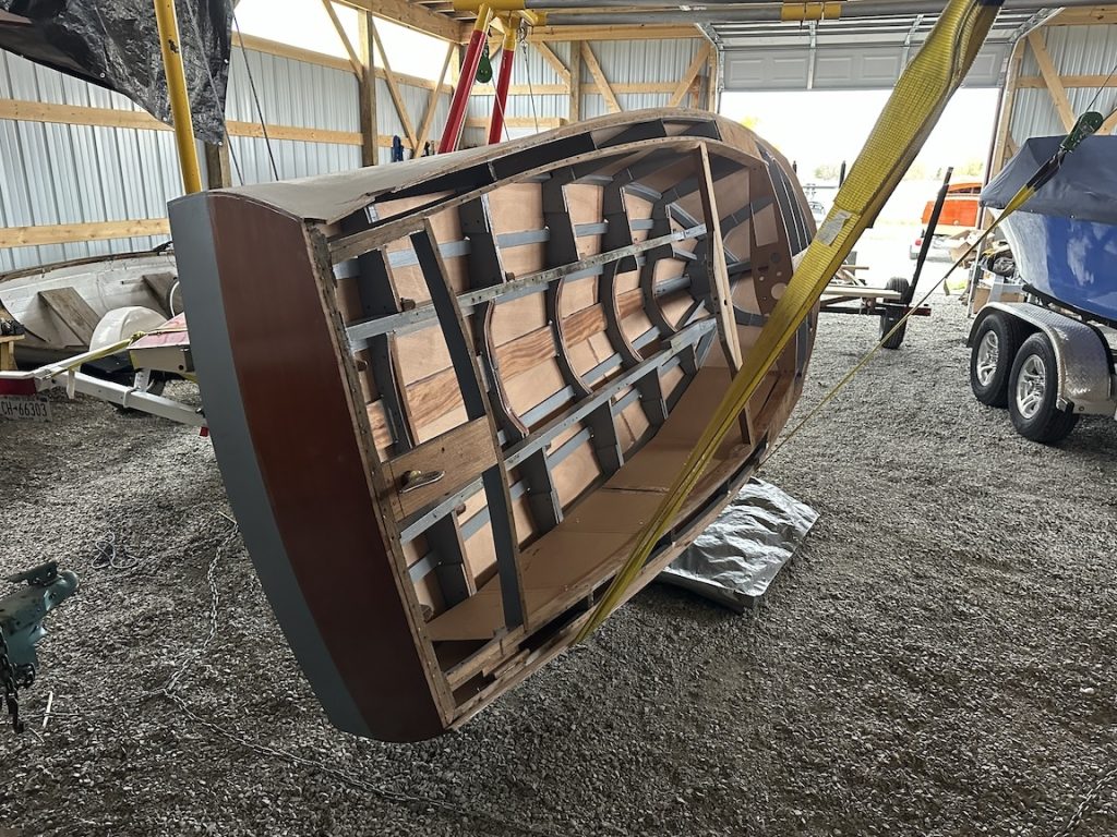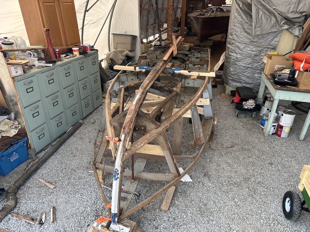 I brought it back to the 1000 Islands in spring of 2025 and began to work on it. I saved a good portion of the framing mahogany above the chine, none below it. The last image shows the results so far as I am about to put it on an original Correct Craft trailer and head to South Carolina for the winter where the process will continue.